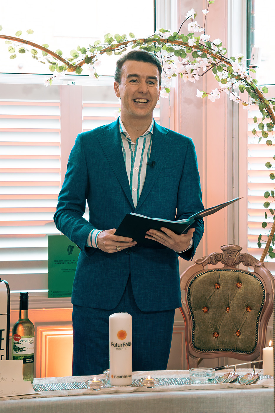 I’m registered with the HSE as a legal wedding solemniser and ordained as a FuturFaith Minister, which means I welcome couples of all backgrounds, spiritualities, or faiths or none at all. At its core, I see a ceremony as more than just an event. It’s a moment of pause, a chance to mark something real, and to stand together in it with intention.