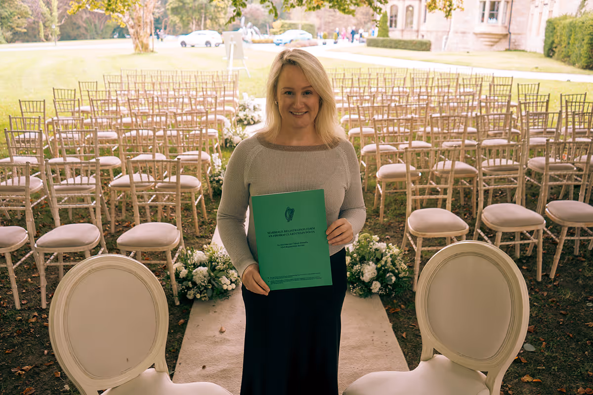 As a registered solemniser, Ciara can legally marry couples across Ireland, offering guidance and support throughout the entire process. With her calm presence and attention to detail, she ensures a seamless and memorable experience for all involved.